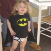 Description: Small child in Batman shirt, cape, and underpants